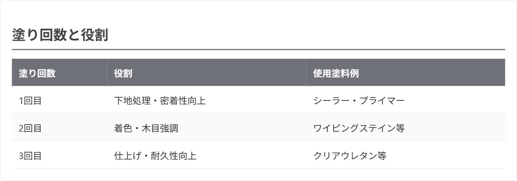 ワイピング塗装では「3回塗り」が推奨されます。1回目は下地の密着性向上と木部の保護、2回目は着色による木目強調、3回目は仕上げ・耐久性付与が目的です。各工程で使用する塗料や乾燥時間を守ることで、色ムラや剥がれを防ぎます。表で役割を整理します。