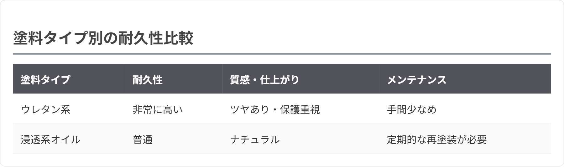 耐久性重視ならウレタン系・造膜系塗料がおすすめです。摩耗や水濡れに強く、長期使用にも安心です。浸透系塗料はメンテナンスが必要ですが、木の呼吸を妨げず質感が良いのが特長です。